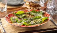 Lâminas finas de lagarto bovino, com molho de mostarda, parmesão e rúcula. Acompanha pizza branca
