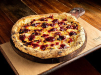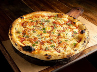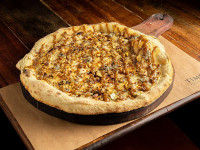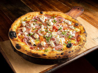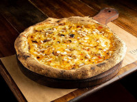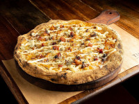Pizza branca, gorgonzola, parmesão, mussarela, catupiry, bacon mel e alecrim.