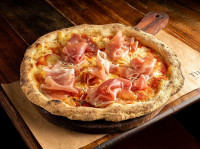 molho de tomate, mussarela, presunto de parma e mel levemente picante.
