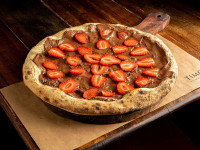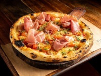 Molho de tomate, mussarela, tomate confitado, molho pesto e presunto de parma.