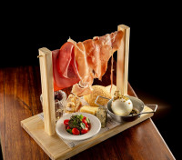 Mortadela bollonha, presunto de parma, tomates confitados, burratinha, acompanhado de pão da casa, gorgonzola, parmesão brie e azeitonas.