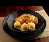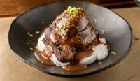 Massa de pizza frita, recheada de banana assada, doce de leite e sorvete de creme.