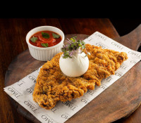 Filé mignon com mortadela italiana a milanesa, acompanhada de burratinha e molho pomodoro.