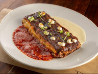 Assado no forno a lenha com azeite e alecrim. Acompanha molho de tomates frescos.