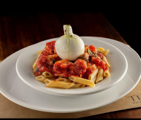 Penne com camarões ao molho pomodoro, com azeitonas pretas, manjericão e alcaparras e burratina.